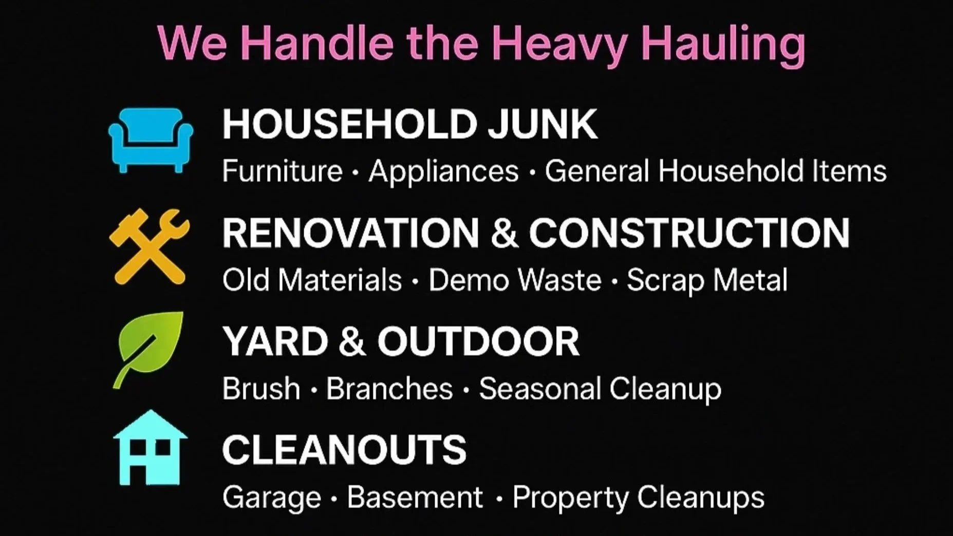 Our junk removal services cover a wide range of cleanup situations, from single items to full cleanouts.