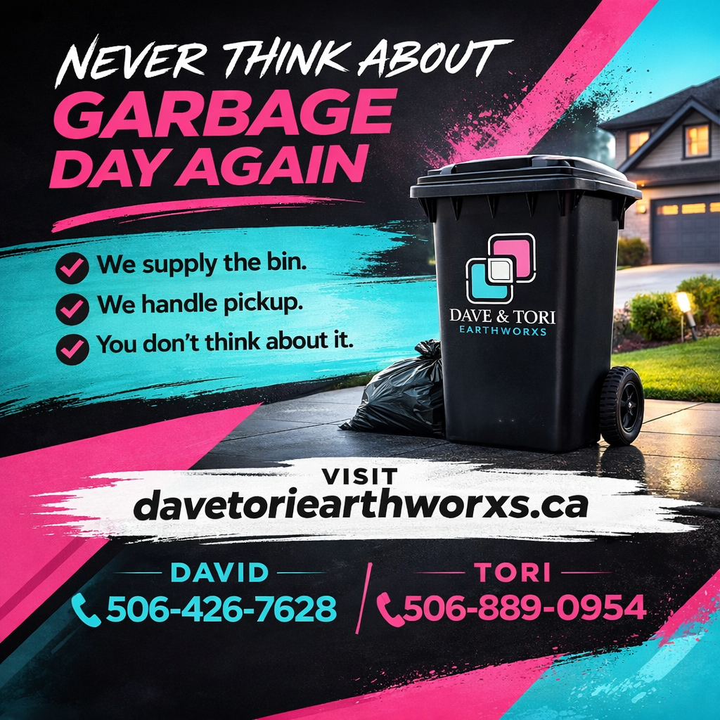 Private weekly garbage pickup with structure and consistency. Dave & Tori Earthworxs supplies a durable residential garbage bin, delivers it directly to your property, and provides scheduled weekly collection throughout Moncton, Riverview, and Dieppe. The service is straightforward, reliable, and professionally managed from start to finish.